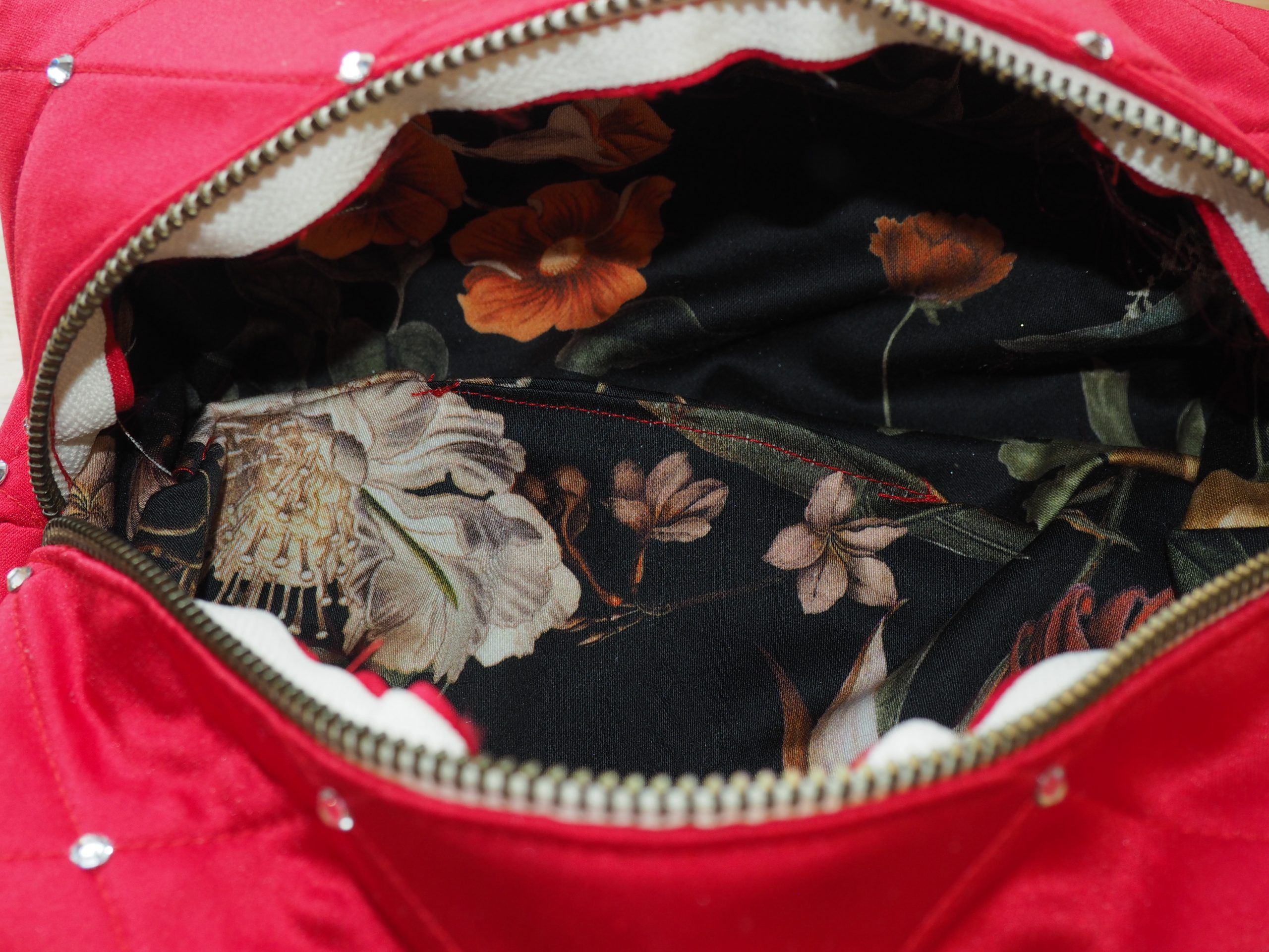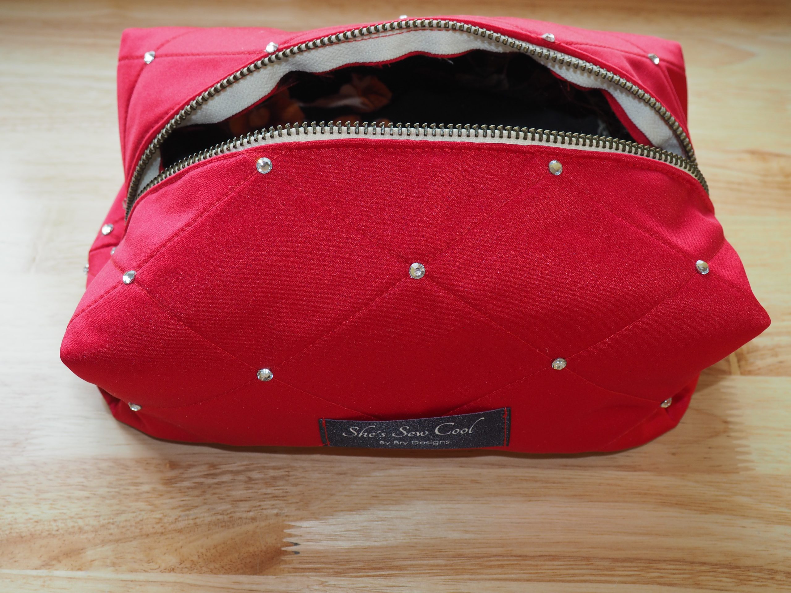 This red satin quilted make-up bag is lined with a beautiful floral lining and decorated with rhinestones.